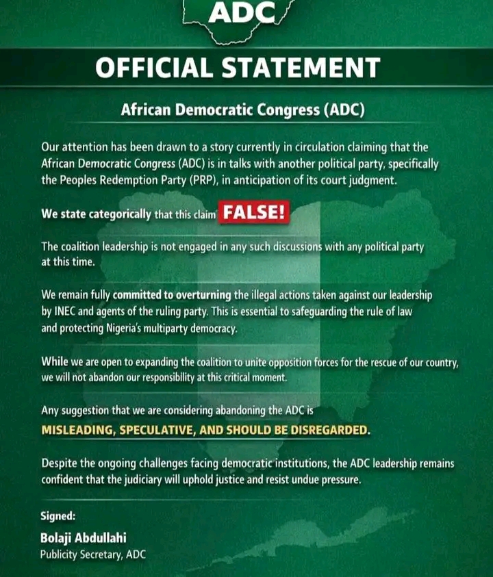 Our attention has been drawn to a story in circulation that the African Democratic Congress (ADC) is in talks with another political party, specifically the Peoples Redemption Party (PRP), in anticipation of its court judgment.