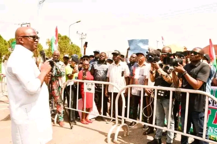 Chief of Staff, Government House, Hon. Johnson Erijo (left), addressing members of Delta State Chapter of the Nigeria Labour Congress (NLC) on behalf of Governor Sheriff Oborevwori, at the Government House Gate, Asaba, on Wednesday during a Nation-wide solidarity protest against insecurity in the Country