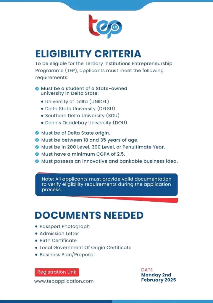 ‎The Delta State Government has announced the commencement of registration for the Tertiary Institutions Entrepreneurship Programme (TEP), an initiative aimed at promoting innovation, entrepreneurship, and economic empowerment among students of state-owned tertiary institutions.