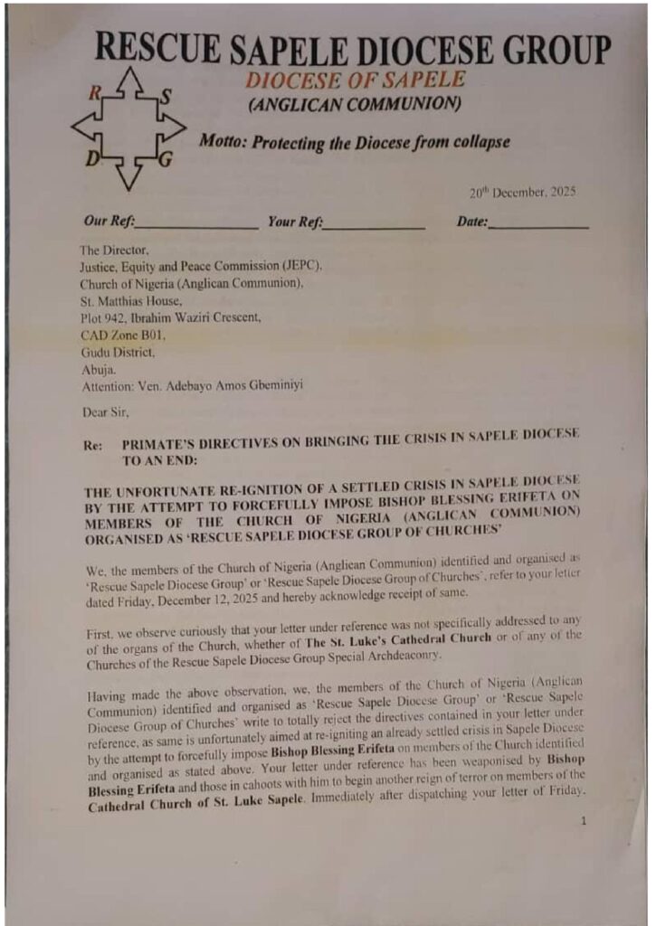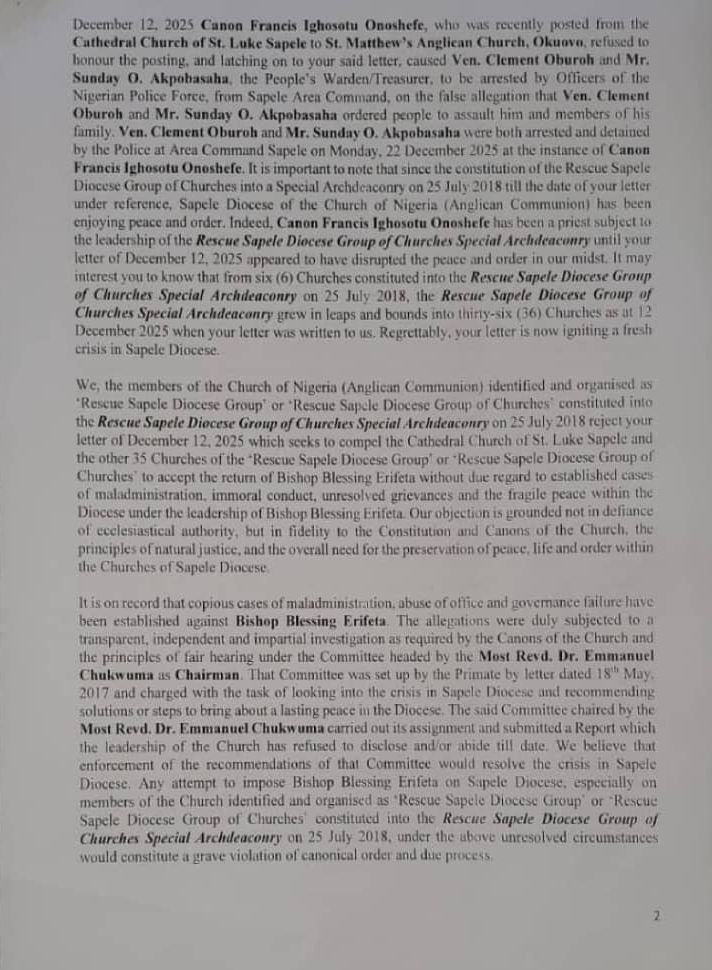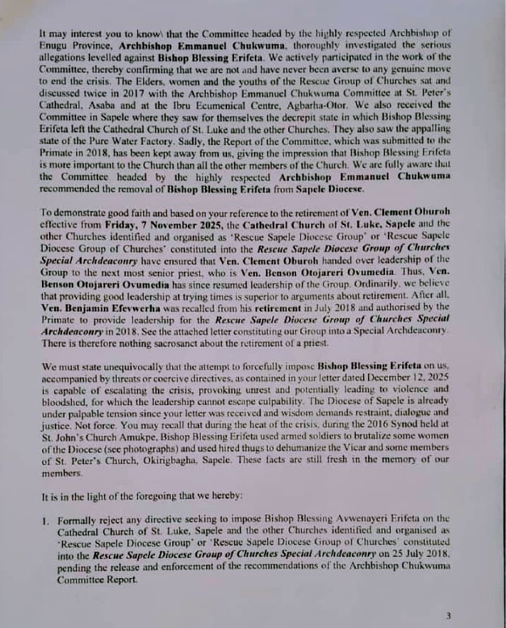 “We, the members of the Church of Nigeria (Anglican Communion) identified and organized as ‘Rescue Sapele Diocese Group’ or ‘Rescue Sapele Diocese Group of Churches constituted into the Rescue Sapele Diocese Group of Churches Special Archdeaconry on 25 July 2018 reject your letter of December 12, 2025, which seeks to compel the Cathedral Church of St. Luke Sapele and the other 35 Churches of the “Rescue Sapele Diocese Group” or “Rescue Sapele Diocese Group of Churches to accept the return of Bishop Blessing Erifeta without due regard to established cases of maladministration, immoral conduct, unresolved grievances and the fragile peace within the Diocese under the leadership of Bishop Blessing Erifeta.