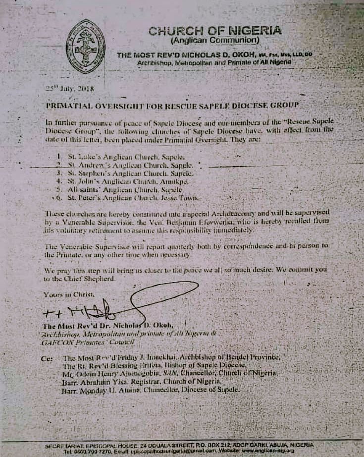 “It is important to note that since the constitution of the Rescue Sapele Diocese Group of Churches into a Special Archdeaconry on 25 July 2018 until the date of your letter under reference, Sapele Diocese of the Church of Nigeria (Anglican Communion) has been enjoying peace and order.