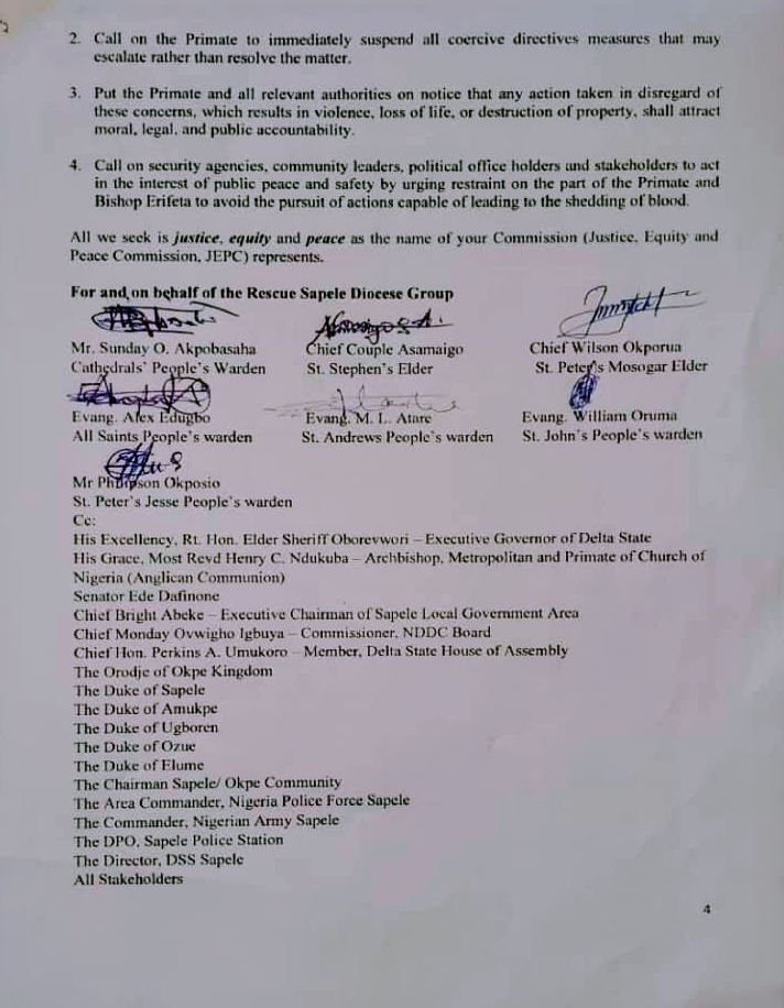 The letter, which was signed by Mr. Sunday O. Akpobasaha, Cathedral ‘People’s Warden; Evang. Afex Edigbo, All Saints People’s Warden; Mus. Mr. Physon Okposio, Chief Couple Asamaigo, St. Stephen’s Elder, Evang. M. L. Atare, St. Andrews People’s Warden; Chief Wilson Okporus, St. Peter’s Mosogar Elder; Evang. William Oruma St. John’s people’s warden and St. Peter’s Jesse people’s warden, specifically called on the Delta State Governor, His Grace, Most Revd. Henry C. Ndukuba, Archbishop, Metropolitan, and Primate of the Church of Nigeria (Anglican Communion); Senator Ede Dafinone; Chief Bright Abeke, Executive Chairman of Sapele Local Government Area; Chief Monday Ovwigho Igbuya; all security agencies; community leaders; political office holders; and stakeholders, to act swiftly in the interest of public peace and safety, by urging restraint on the part of the primate and Bishop Erifeta to avoid the pursuit of actions capable of leading to the shedding of blood.