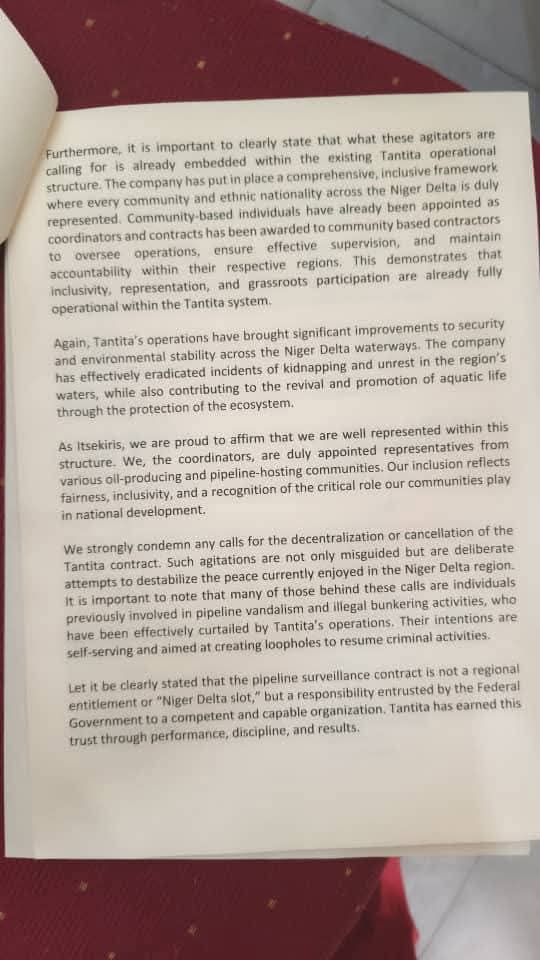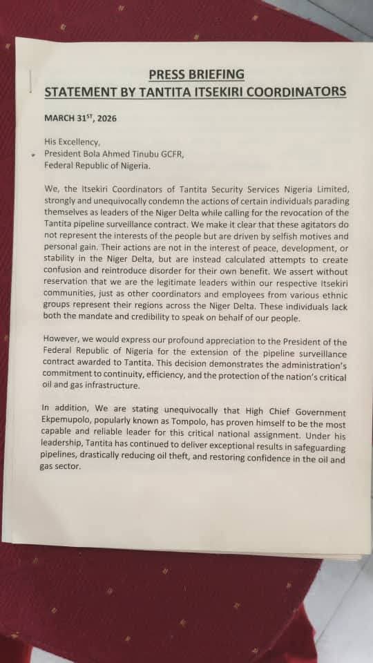“We strongly and unequivocally condemn the actions of certain individuals parading themselves as leaders of the Niger Delta while calling for the revocation of the Tantita pipeline surveillance contract. These agitators do not represent the interests of the people but are driven by selfish motives and personal gain.