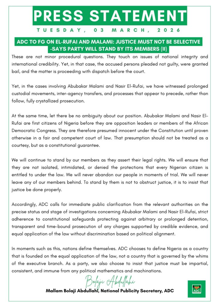 As a law-abiding party, it is important to state for the record that the ADC believes no citizen, regardless of stature or past office, is above the law. However, in a constitutional democracy where the law is seen to operate selectively, it becomes imperative to insist, firmly and without apology, that justice must be applied evenly, transparently, and without political calculation, particularly in cases such as those involving Abubakar Malami and Nasir El-Rufai, where the manner, speed, and sequence of enforcement actions have understandably raised serious public concern about consistency and fairness.