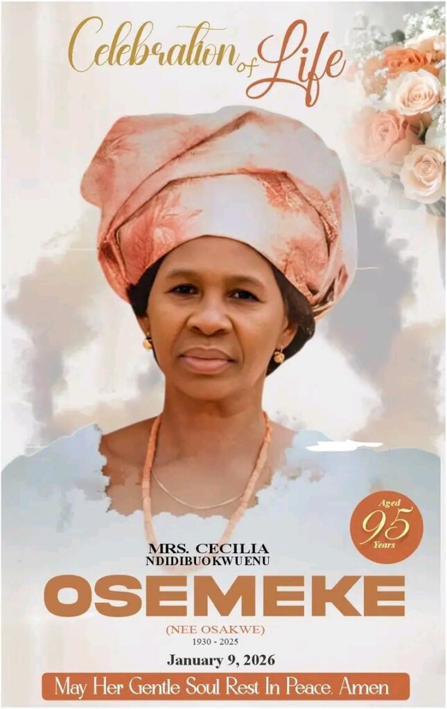 The remains of late Mrs. Cecilia Ndidibuokwuenu Osemeke, mother-in-law to the Chairman of the Nigerian Institute of Public Relations (NIPR), Delta State Chapter, Godfrey C. Osakwe, fnipr, were laid to rest on Friday, January 9, 2026, in her hometown of Onicha-Ugbo, Aniocha North Local Government Area of Delta State.