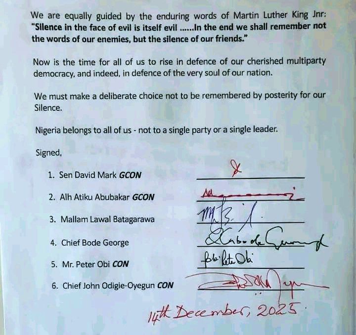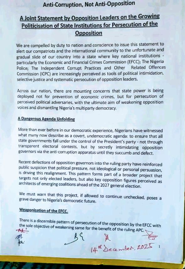 We are compelled by duty to nation and conscience to issue this statement to alert our compatriots and the international community to the unfortunate and gradual slide of our country into a state where key national institutions – particularly the Economic and Financial Crimes Commission (EFCC); The Nigeria Police; The Independent Corrupt Practices and Other Related Offences Commission (ICPC) are increasingly perceived as tools of political intimidation, selective justice and systematic persecution of opposition leaders.