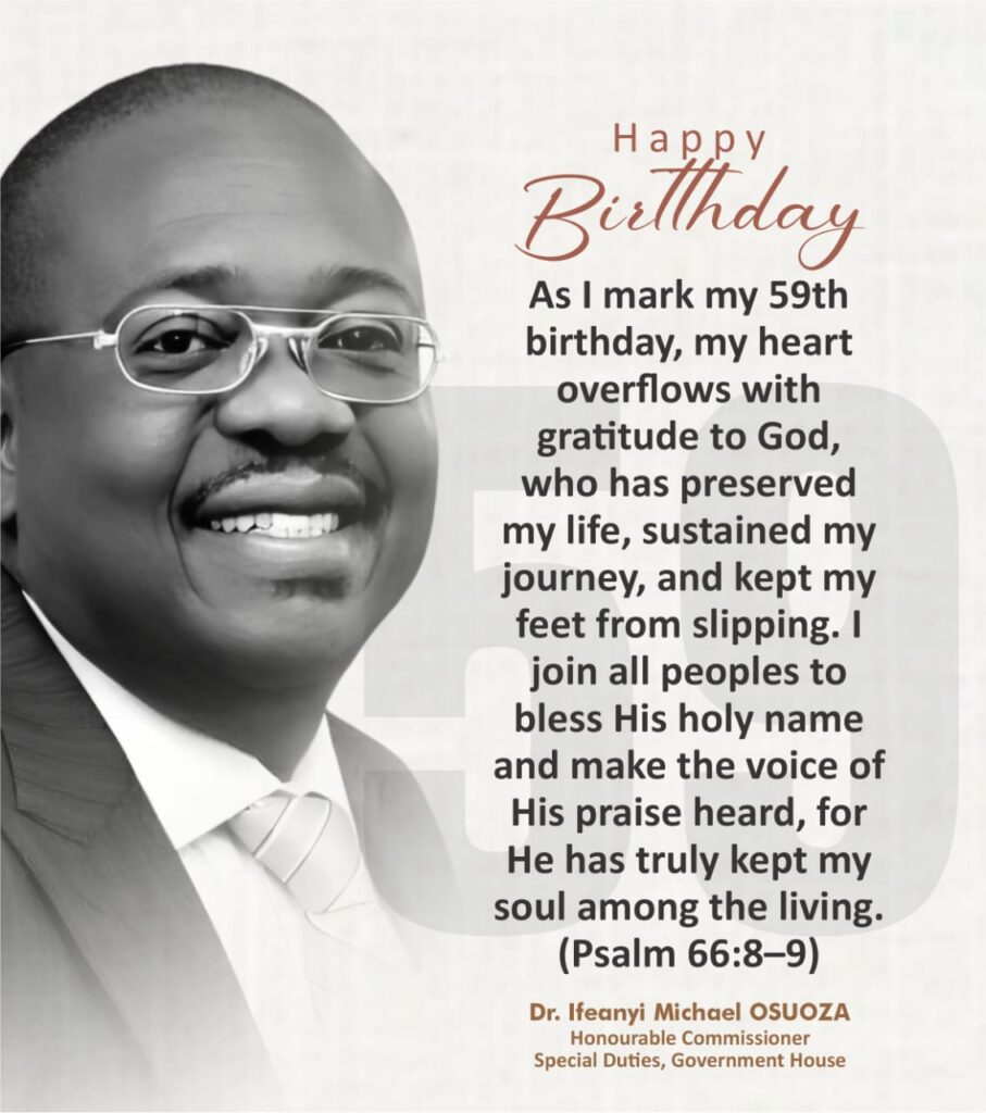 Delta State Commissioner for Special Duties (Government House), Dr ifeanyi Osuoza, has expressed joy and thanksgiving to God Almighty, for granting him the divine favour to celebrate his 59th birth anniversary, in good health, sound mind and deeply profound gratitude for sustaining, blessing and preserving him, through trials and triumphs, over the years.