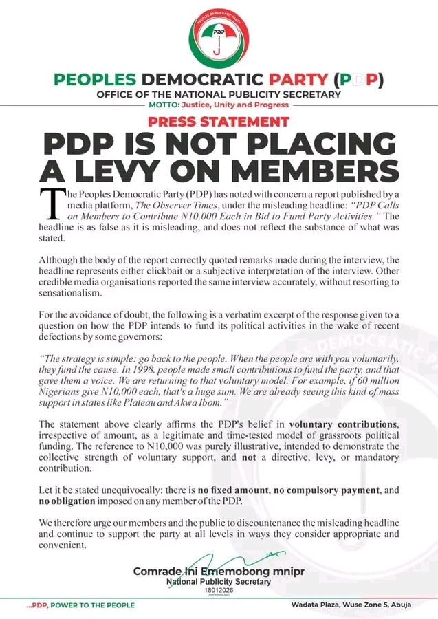 The Peoples Democratic Party (PDP) has noted with concern a report published by a media platform, The Observer Times, under the misleading headline: “PDP Calls on Members to Contribute N10,000 Each in Bid to Fund Party Activities.” The headline is as false as it is misleading, and does not reflect the substance of what was stated.