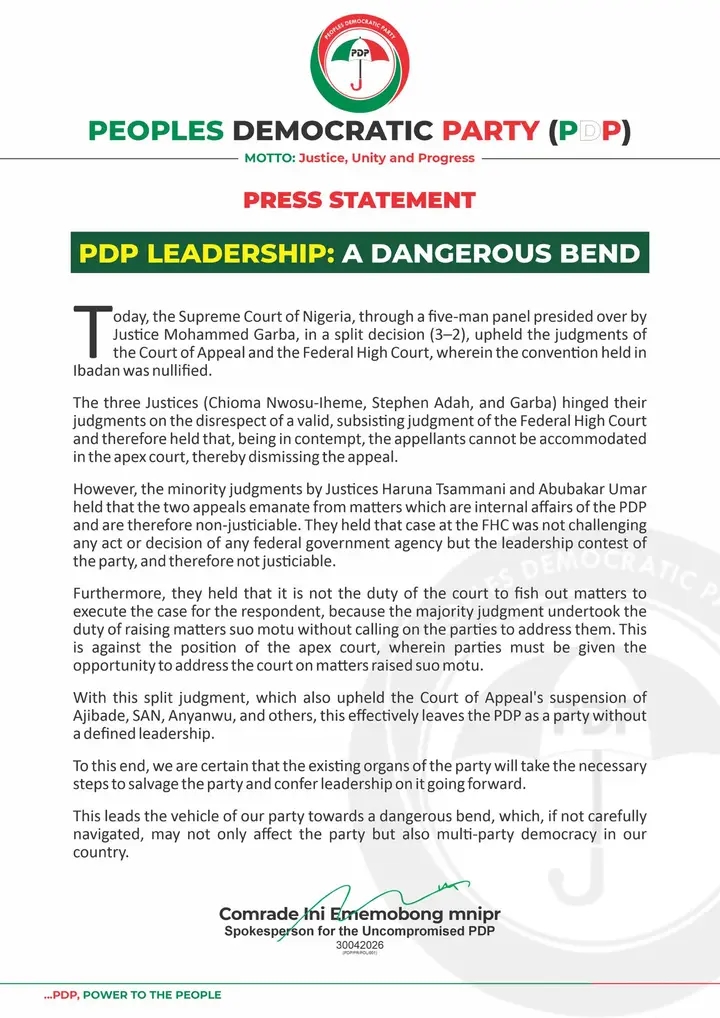 With this split judgment, which also upheld the Court of Appeal’s suspension of Ajibade, SAN, Anyanwu, and others, this effectively leaves the PDP as a party without a defined leadership.