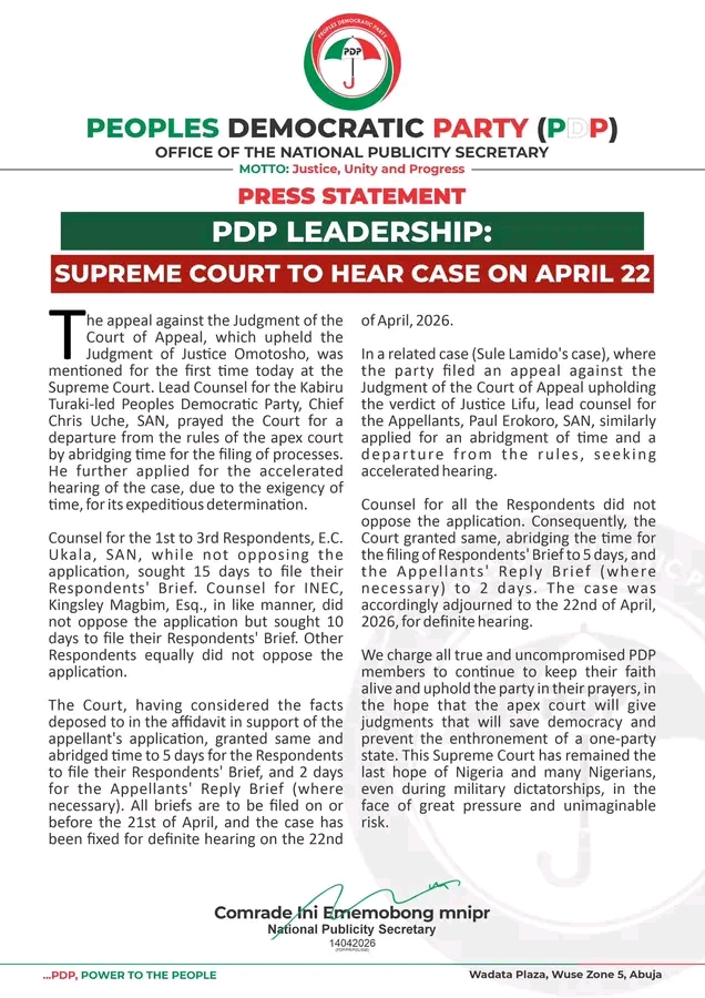 We charge all true and uncompromised PDP members to continue to keep their faith alive and uphold the party in their prayers, in the hope that the apex court will give judgments that will save democracy and prevent the enthronement of a one-party state. This Supreme Court has remained the last hope of Nigeria and many Nigerians, even during military dictatorships, in the face of great pressure and unimaginable risk.