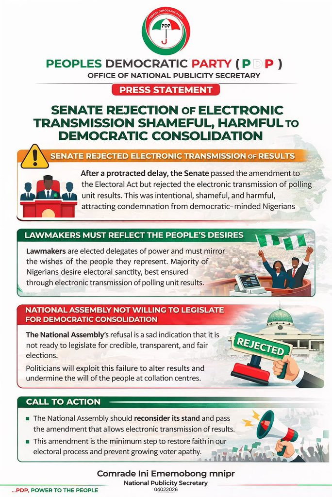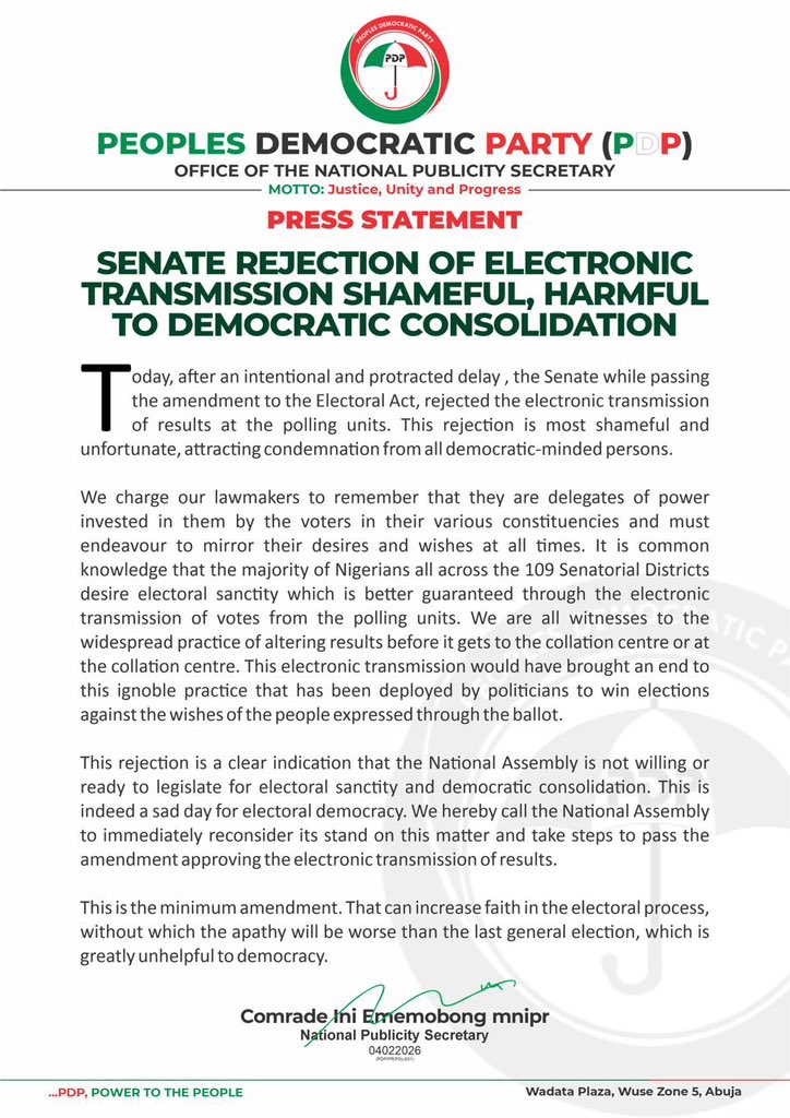 Today, after an intentional and protracted delay , the Senate while passing the amendment to the Electoral Act, rejected the electronic transmission of results at the polling units. This rejection is most shameful and unfortunate, attracting condemnation from all democratic-minded persons.