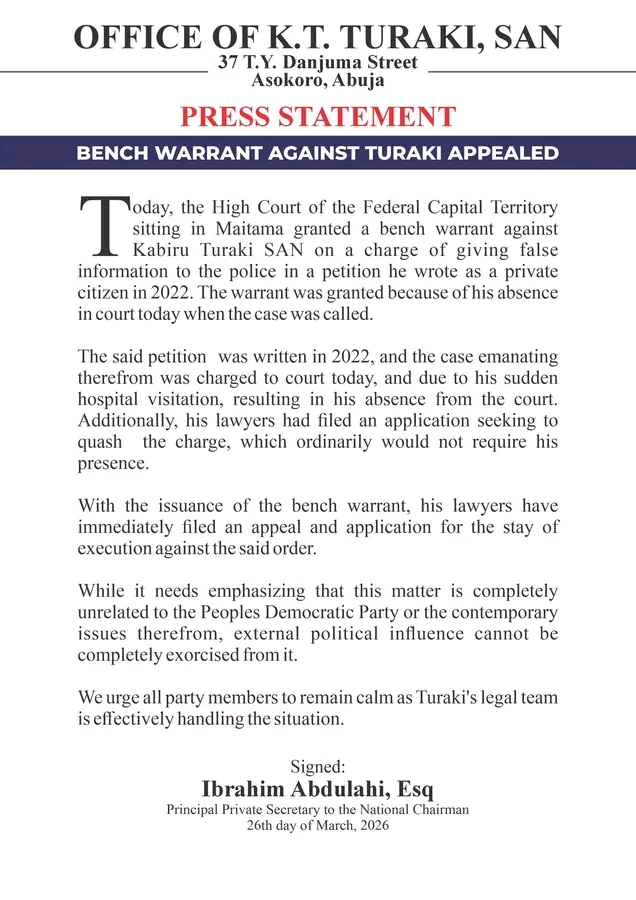 Today, the High Court of the Federal Capital Territory sitting in Maitama granted a bench warrant against Kabiru Turaki SAN on a charge of giving false information to the police in a petition he wrote as a private citizen in 2022. The warrant was granted because of his absence in court today when the case was called.