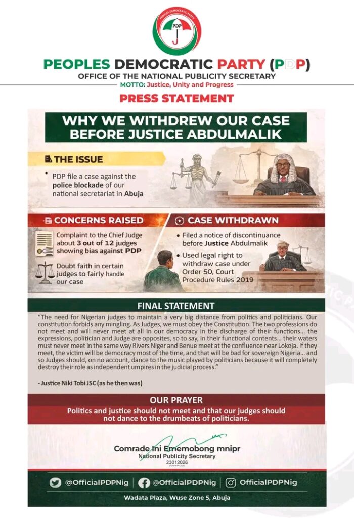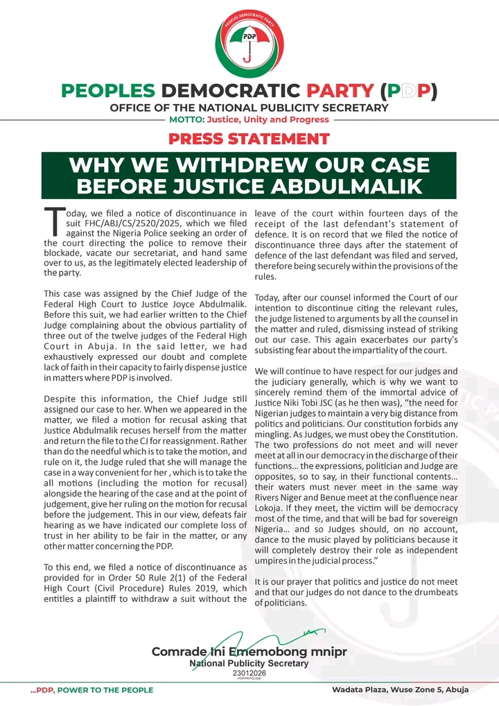 Today, we filed a notice of discontinuance in suit FHC/ABJ/CS/2520/2025, which we filed against the Nigeria Police seeking an order of the court directing the police to remove their blockade, vacate our secretariat, and hand same over to us, as the legitimately elected leadership of the party.